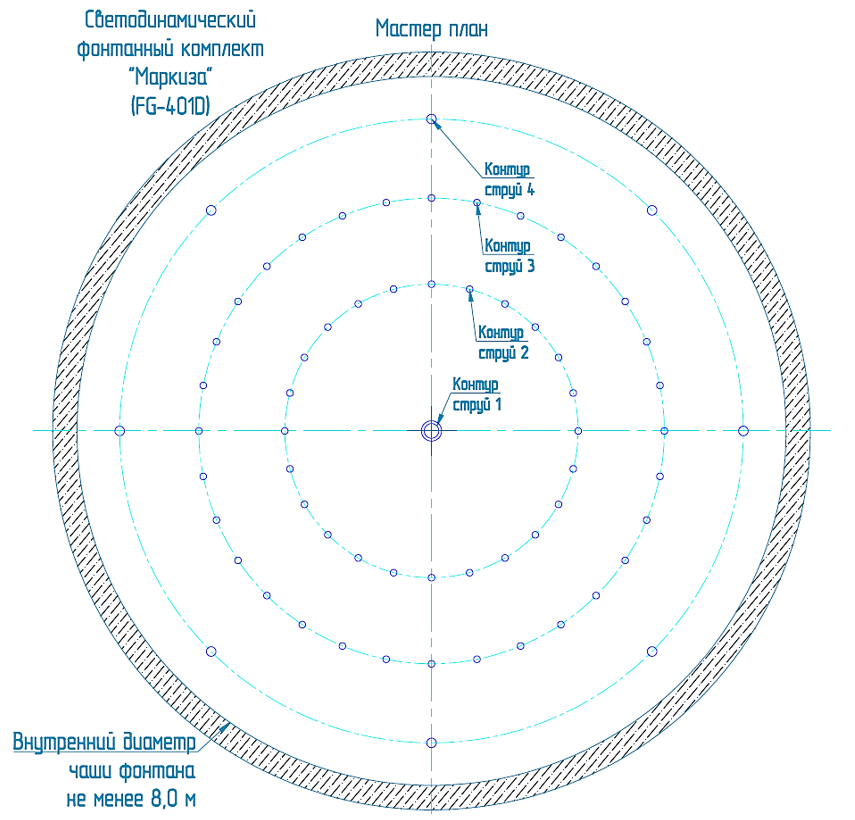 Статический - водная картина не меняется. Встроена программа переключения цветов подсветки. Высота струй может быть отрегулирована при помощи запорной арматуры.