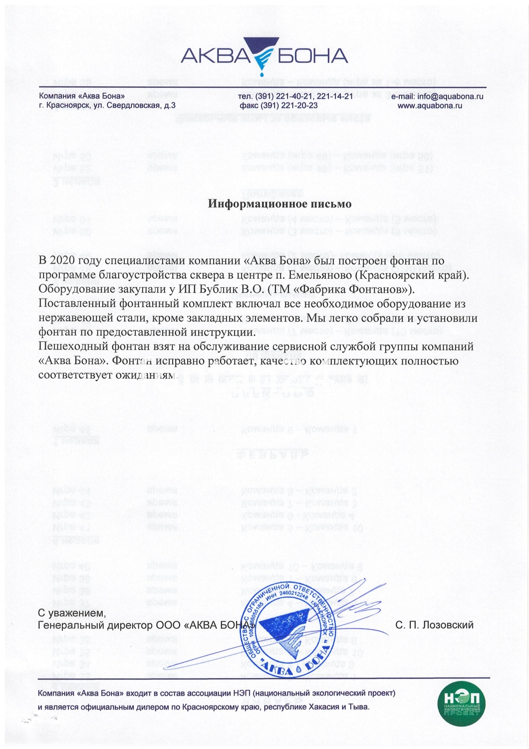 В 2021 году перед нами стояла задача установки фонтана в рамках благоустройства зоны отдыха в центре города. Был организован аукцион на поставку фонтанного оборудования, который выиграл ИП Бублик. В.О. (ТМ «Фабрика Фонтанов»). Специалисты не просто изготовили комплектующие по техзаданию, но и дали грамотные рекомендации по строительным работам. В результате мы легко организовали установку фонтана своими силами по месту, сэкономив бюджетные средства. Спасибо за профессионализм.